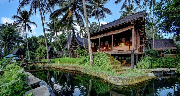 These bungalows in Bali, Indonesia are built from natural materials, evoking a sense of calm and tranquility. On Bambu Indahโ€™s property, you can find a lovely natural pond thatโ€™s perfect for a swim in nature.
